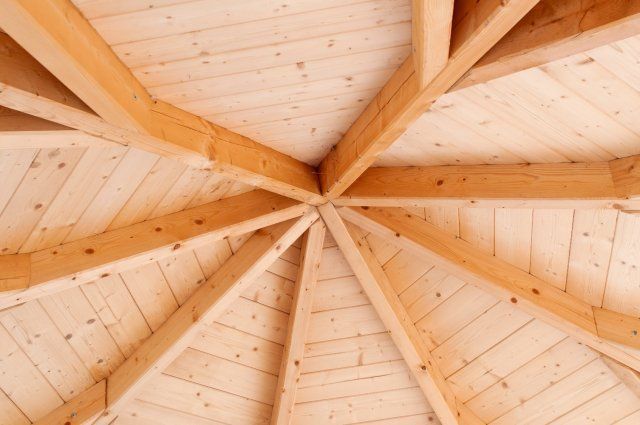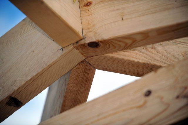 Далі кріпляться крокви. Вони повинні з'єднуватися між собою у верхній точці, а нижніми кінцями спиратися на несучі стовпи. Тобто, виходить каркас для даху. Його можна зібрати на землі, а потім встановити. Але можна збирати відразу на альтанці.