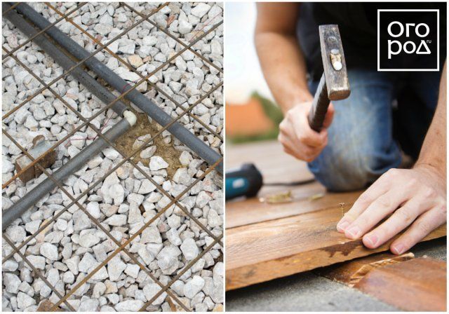 Крок 3. залити фундамент. Виняток може бути тільки в тих випадках, коли основу становитимуть вкопані вертикально дерев'яні стовпи. Хоча, найчастіше комбінують стовпи і фундамент. Зрозуміло, в цьому випадку стовпи повинні бути відповідним чином підготовлені (про це нижче) і їх теж рекомендується забетонувати. Якщо земля глиниста, то стовпи краще, так як глина може або поплисти від води, або нерівномірно промерзати, від чого фундамент буде "грати" і може лопнути. Для його зміцнення використовують арматуру.
