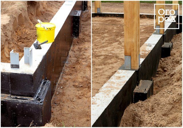 У тих місцях, де дерево контактує з фундаментом або підпірними стовпчиками з цегли, необхідно підкладати руберойд для гідроізоляції. Цей же покладений брус буде використовуватися і в якості лаг при настилання підлоги.