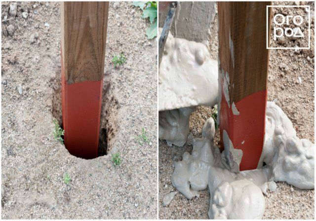 Глибина ям під стовпи або траншеї під стрічковий фундамент залежить від особливостей ґрунту, ступеня його промерзання взимку і глибини залягання грунтових вод. У будь-якому випадку, краще зробити його товщиною не менше 50 см. Висота над рівнем землі – 5-10 см. Фундамент повинен вистояти не менше трьох днів, перш ніж роботи будуть продовжені.