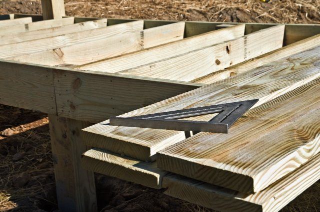 4. Тепер можна приступати до облаштування підлоги. Він настилається обрізів дошками товщиною не менше дюйма. Краще, якщо це буде, наприклад, 40 мм. Оптимальне перетин лаг для підлоги становить 100 × 100 мм. Лаги укладаються на відстані не більше ніж 50 см один від одного.Дошки кріпляться до лагів за допомогою саморізів по дереву. Можна використовувати цвяхи, але в цьому випадку згодом буде складніше замінити окрему дошку, якщо виникне така необхідність.