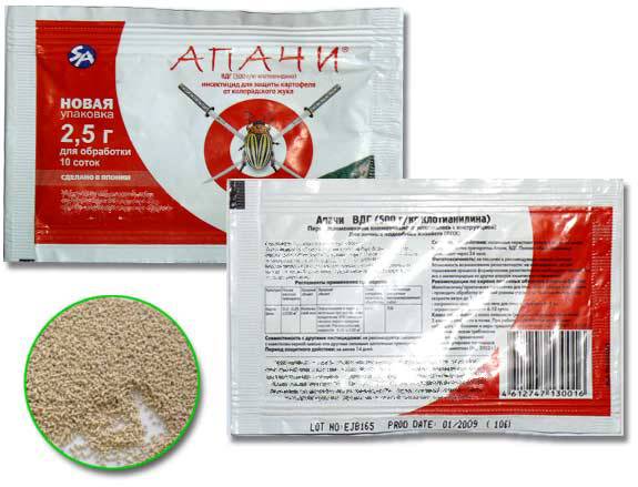 Концентрація діючої речовини в препараті становить половину його ваги. Гранули, що мають бежевий колір, добре розчиняються у воді. Препарат при розведенні не утворює пилових частинок, як це буває при розведенні порошку. А хороша розчинність убезпечить листя від опіків. Увага! Препарат Апачі швидко всмоктується листовим апаратом картоплі і зберігає свою концентрацію близько місяця, залишаючись отруйним для дорослих особин і личинок колорадського жука, надійно захищаючи рослини навіть при отрастании молодих пагонів.