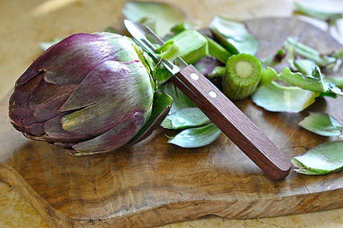 Артишоки миються, очищаються від всіх довгих листя, і між листочками шишечки просовувати тоненькі пластинки часничку і вносять масло. 20 хвилинок на пару – смачне і корисне блюдо готове.
