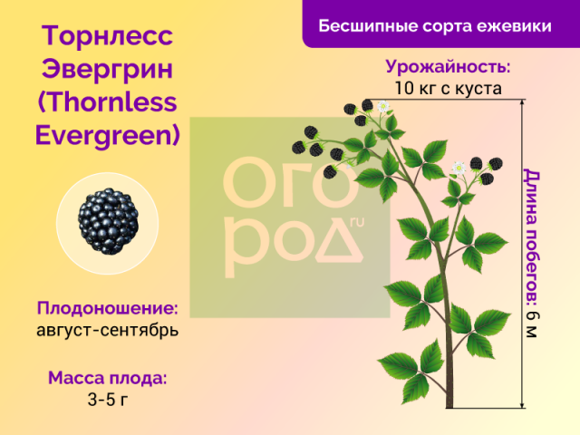 Морозостійкий високоврожайний сорт, який вийшов в результаті мутації колючого сорти Евергрін. Кущ дуже потужний з довгими пагонами, які можуть досягати 6 м. Ягоди дрібні, масою 3-5 г, проте в одній руці їх може бути від 25 до 70 штук, що дозволяє збирати з куща близько 10 кг плодів. Коли вони повністю визрівають, то втрачають свою кислинку і стають ненав'язливо солодкими.