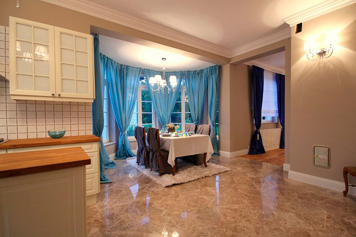 - Їдальня. Виступ – ідеальне місце для обідньої групи. Для місць, розташованих спиною до вікна, можна використовувати не стільці, а спеціально підготовлений для цього підвіконня.