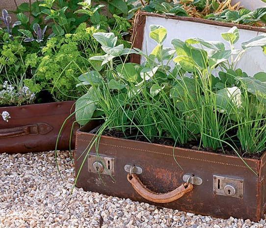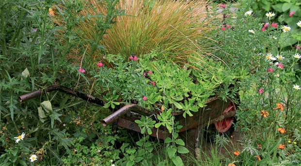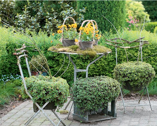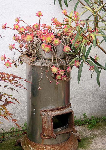 Що вийшла з ужитку тачка, забута і занедбана, знайшла друге життя, коли її поставили в далекому куточку ділянки і заселили рослинами. Щоб метал не втрачав своєї міцності і не іржавів при взаємодії з грунтом, рослини краще посадити в горщики, які потім розмістити в тачці, а проміжки між ними заповнити корою або іншим декоративним матеріалом. Ще одне металевий виріб, пічка-буржуйка, ставши подіумом для квітів, теж продовжило існування в новій для себе ролі.