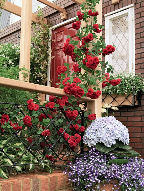 Ганок, бруковане клінкерною плиткою або цеглою, прикрашають контейнерними композиціями в горщиках з необпаленої глини. Поверхня високих вазонів, облитих темної глазур'ю, стилізована під лиття. У ці судини, симетрично стоять по краях ганку, висаджують Діхондра сріблясту з романтичною назвою "Сріблястий водоспад" – її спадаючі стебла, оточені листям, нагадують струмені водоспаду. Діхондра – одне з найвиразніших рослин для посадок в кашпо і підвісні корзини. При розміщенні інших контейнерів принцип симетрії порушують: у низькі горщики висаджують лобелію "Імператор Віллі", настурції "Яскрава клумба", петунію "Ультрафіолет". Вертикаллю на передньому плані лівої групи виділяється сальвія "Комета" з червоними суцвіттями.