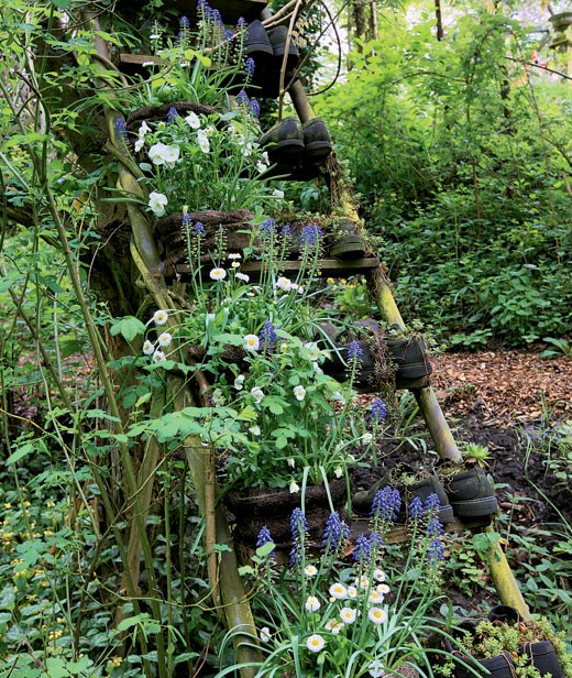 У лісовому куточку пейзажного саду встановили дерев'яну етажерку і "вежу" з дерев'яних брусків. Етажерка служить свого роду подіумом для невеликих горщиків, обгорнутих мішковиною. У горщики висаджені маргаритки і мускари.