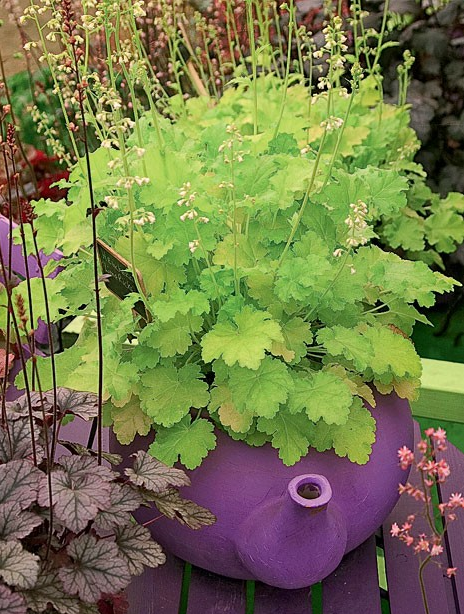 Лимонні листя і бузковий чайник контрастні за кольором – композиція декоративна протягом усього сезону.