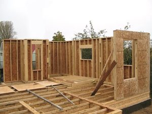 Щитовий будинок необхідно зводити відповідно до плану будівництва. Першою операцією повинно стати спорудження фундаменту. Після цього можна переходити до пристрою каркаса. потім виконується підготовка верхньої і нижньої обшивки, Зводяться крокви і вертикальні опори. Додаткові бруси використовують для формування контуру для дверей і вікон. Використовуючи саморізи, відбувається закріплення зовнішньої обшивки каркаса фанерою. При виконанні робіт по внутрішній обшивці використовують гіпсокартон, ДСП або ДВП.