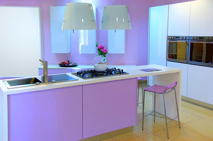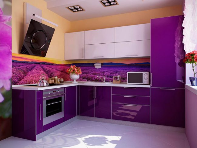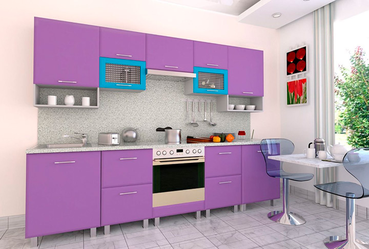 Для обробки кухонного приміщення можуть бути обрані як блідо-бузкові тони, так і більш насичені фіолетові відтінки. При правильно обраній комбінації з іншими квітами будь-яке рішення може виявитися вдалим.