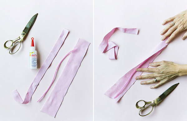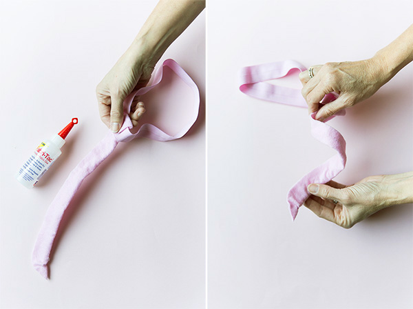 Потрібно вирізати з рожевою плюшевою тканини, вони повинна бути досить м'якою прямокутник для хвостика. Всередину кладемо волохату дріт, приклеюємо її до тканини, а далі склеюємо кінці тканини.