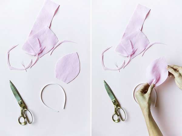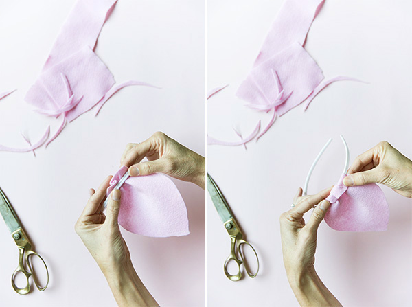 Вирізаємо з рожевого фетру вуха, за розміром побільше, щоб вони виглядали оригінальніше. Трошки прісбаріваем вушка в середині, щоб вийшли скалдочкі.