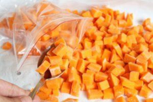 Підготовка проста, така ж, як і в попередньому випадку: очистити від шкірки гарбуз, прибрати семяна, промити під проточною водою, нарізати необхідного розміру скибочками, тільки от є можливість використовувати не тільки харчові контейнери, а й поліетиленові пакети.