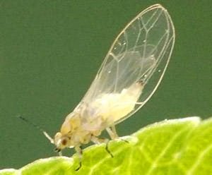 Дрібне, до 2 мм, комаха світло зеленого кольору. Задні ноги стрибальні. Личинки жовто-зелені, ще менше, з бахромою по краях.
