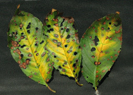 При ураженні вишні коккомикозом її листя жовтіє і на них з'являються дірки