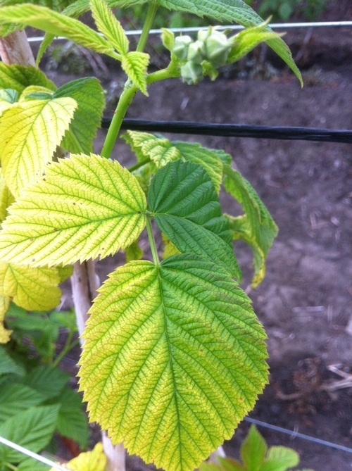 Що робити ? Обробити малинник по листу 1% розчином хелати заліза.