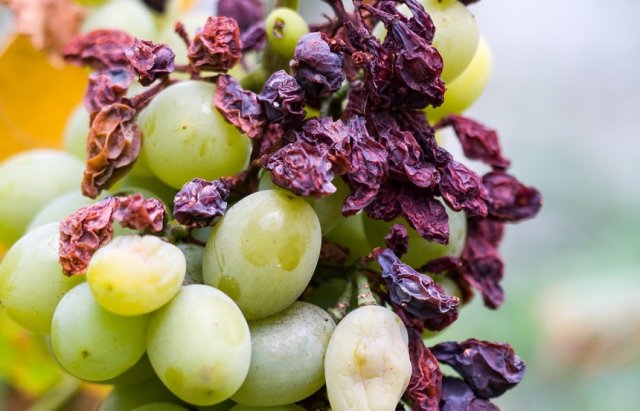 Хоча виноград – теплолюбна рослина, він може страждати від надмірної сонячної активності. У спеку, коли стовпчик термометра показує 30 ° С і вище, на ягодах можуть з'явитися сонячні опіки. Вони виглядають, як невеликі плями сірого або бурого кольору.