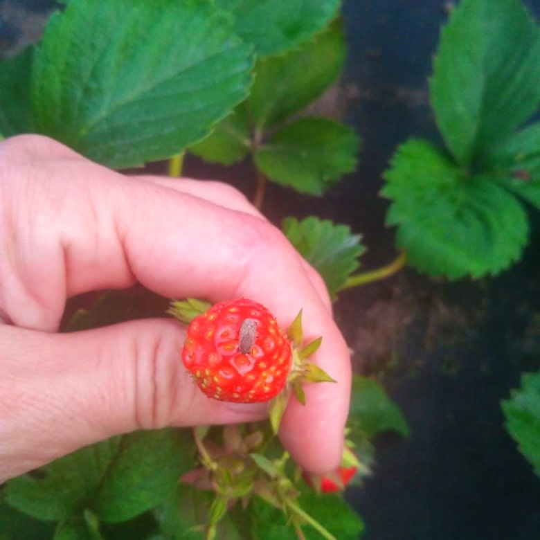 Від присутності шкідників частіше страждають пізньостиглі сорти культури. Дорослі комахи харчуються соком листя. Їх присутність можна визначити за наявністю точкових отворів на листових пластинах, які поступово скручуються, всипають (не розвиваються) або загнивають. Але головна шкода для рослин приносять личинки, які паразити відкладають в квітках. Вони руйнують формуються ембріони в насінні з самого початку розвитку плодів, як правило, на їх кінчиках. В результаті тканини навколо пошкоджених семянок практично не формуються, викликаючи деформацію ягід.
