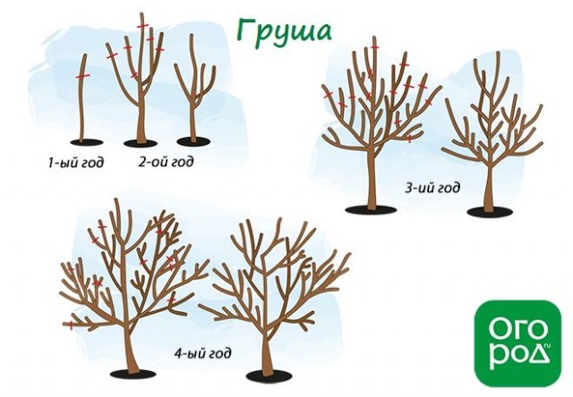 Для того щоб крона груші сприяла плодоношення, потрібно щорічно (включаючи рік посадки) обрізати її і формувати. Причому одним тільки видаленням зайвих пагонів не обійтися. Найчастіше гілки груші ростуть вгору, паралельно стовбуру, або під дуже гострим кутом, і їх доводиться примусово відгинати за допомогою системи підвісних вантажів або петель.