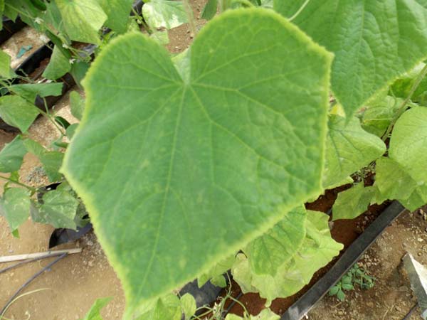 - Старі нижнє листя огірків жовтіють по краях (В центрі вони залишаються зеленими), тобто у них з'являється жовта облямівка (Крайової хлороз).