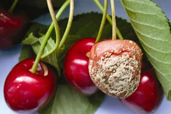 Решта на гілочках плоди в місцях укусів комахами утворюються сірі спороносящих подушечки. Вони розташовані хаотично, і цим відрізняються від сірої плодової гнилі. Муміфіковані плоди, опале листя стануть джерелом зараження на наступний рік. Якщо хвороба запущено, на корі з'являться сірі нарости.