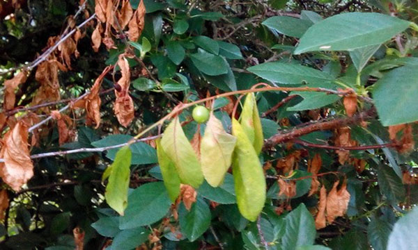 Клястероспоріоз або плямистість – також є причиною, чому сохнуть листя у вишні. Хвороба проявляється по всьому дереву, включаючи коріння. При цьому нирки квітів і листя чорніють, опадають, листя стає, як решето. Решта на гілках вишні муміфікуються і стають носіями суперечка. Грибниця знищується хлорокисью міді і бордосской сумішшю.