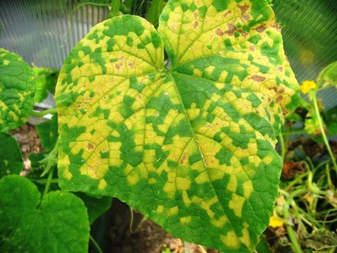 У теплиці може бути виявлений вірус огіркової мозаїки. Він являє собою некротичний штам, який є найнебезпечнішим з фітовірусів. Сівозміна в даному випадку не допомагає.