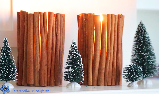 Робиться таке новорічну прикрасу квартири дуже швидко – обкладає свічку навколо паличками кориці, склеюючи їх між собою. А потім обв'язуємо декоративною стрічкою. Коли ця свічка буде горіти, вона буде виділяти чарівний аромат кориці і ще чогось невловимо чарівного і зимового.