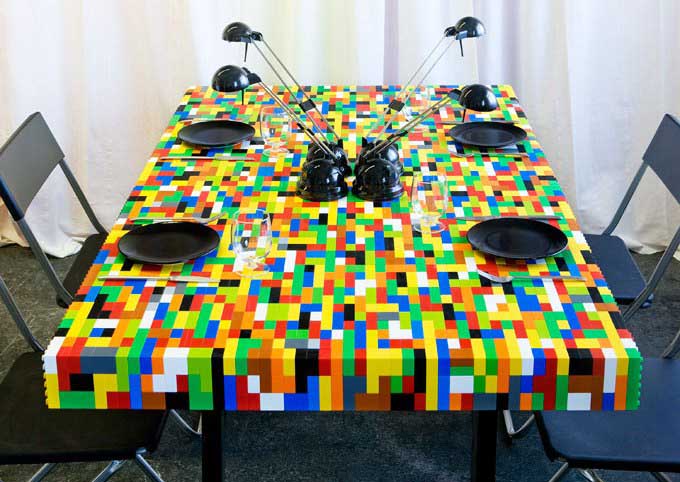 Деталі «Лего» можна застосовувати для спеціального окремо розташованого столу посередині кухні. Поверхня вироби рекомендується використовувати як обробну, а можна вбудувати варильну панель або мийку. Представлене рішення подарує кухні зовсім новий вид.