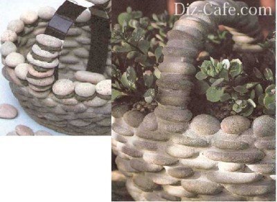Потім викладається ще 2-3 ряди гальки, останній ряд, для того щоб надати виробу оригінальність, можна викласти круглими камінчиками. Після закінчення кладки залиште кошик застигати на пару годин.