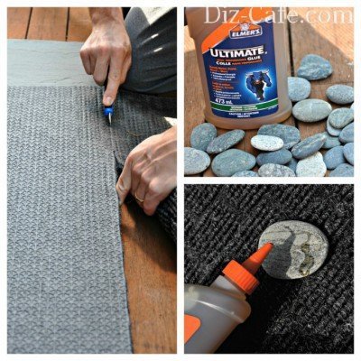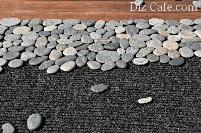 Необхідні складові для створення килимка: ковролін, клей, ніж і плоска галька. Такий килимок можна використовувати і в саду, і біля входу в будинок, і в інтер'єрі. Можна аналогічним чином зробити і підставки для садового сервізу