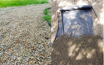 У поглиблення укладається спеціальна тканина. Кути можна закріпити обмежувачем, в цьому випадку фіксація бордюру робиться після укладання тканини, або притиснути плоскими каменями. Тканина буде захищати доріжку від бур'янів. Отримане підставу доріжки заповнюється сумішшю гравію і дрібної гальки, розрівнюється лопатою або граблями. Якщо потрібно подекуди додати каменів, зробіть це. Полийте доріжку зі шланга – гравій стане чистіше, і насип трохи осяде і вирівняється.