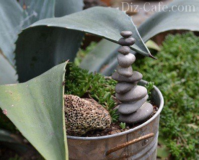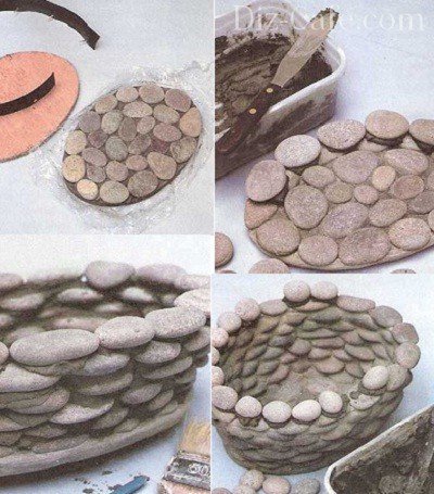 Для того, щоб «обшити» галькою квітковий горщик, зручно використовувати цементний розчин. Підберіть камінчики приблизно однаково розміру і укладайте їх ребром. Дрібні камені можна кріпити і підставою. Прошарок цементу можна пофарбувати, або пофарбувати в який-небудь один або кілька кольорів саму гальку – тут вже на ваш розсуд. В якості підстави, підставки для горщика, підійде великий плоский валун, якщо ви такий знайдете. Рослини в таких горщиках виглядають привабливо і природно.