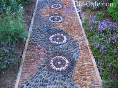 На доріжці з гальки з чітко зафіксованими камінням можна створювати найрізноманітніші візерунки, орнаменти, малюнки, використовувати різні кольори, яскраві фарби. Галька сьогодні стає все більш популярними матеріалом – вона використовується і в ландшафтному дизайні, і в дизайні інтер'єрів. Матеріал цей можна купити, а якщо є можливість – привезти з морського узбережжя.