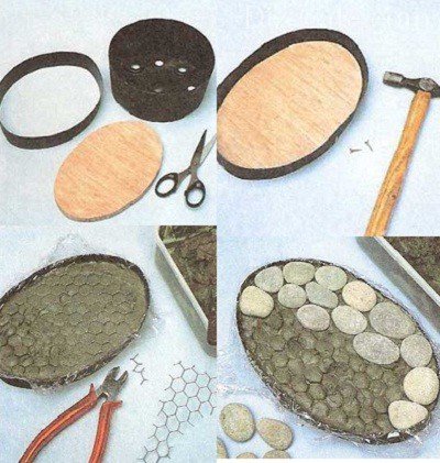 На плоску сторону камінчиків наноситься цементний клей і вони приклеюються до основи. Коли ви приклеїте все каміння до основи, залиште його на ніч застигати. Після висихання пластиковий обідок потрібно видалити і відокремити від фанери готове підставу. Переверніть його, зніміть плівку.