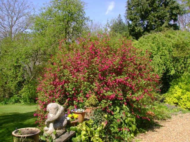 Кращі партнери для криваво-червоної смородини: форзиція, ліщина, гамамелис, декоративні калини, ірга Ламарка, дицентра, тюльпани, нарциси, мускарі, незабудки та інші квітучі навесні багаторічники і цибулинні.