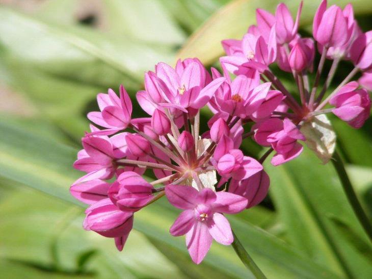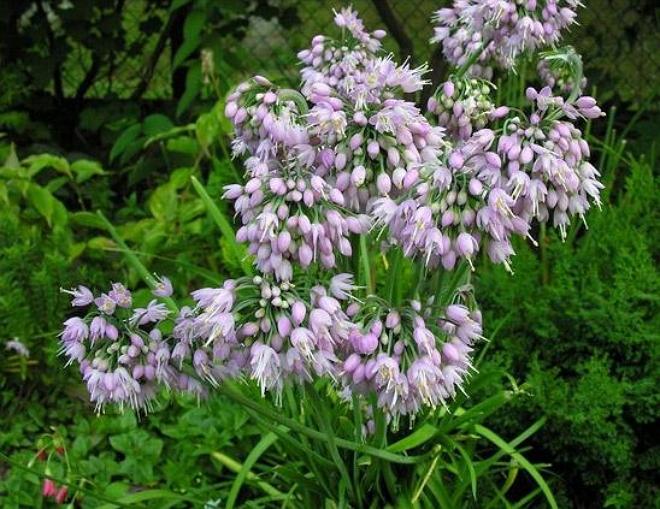 Це різновид цибулі горолюбівого. На початку літа рослина випускає квітконоси з пухкими малиново-бузковими суцвіттями, які складаються з невеликих квіточок, схожих на знак пентаграми: у них 6 пелюсток, 3 з яких, розташовані через один, коротше інших.А довгі і вузькі листя рослини виділяють нехарактерний для лука аромат.