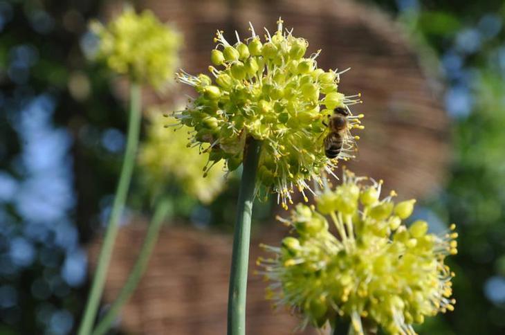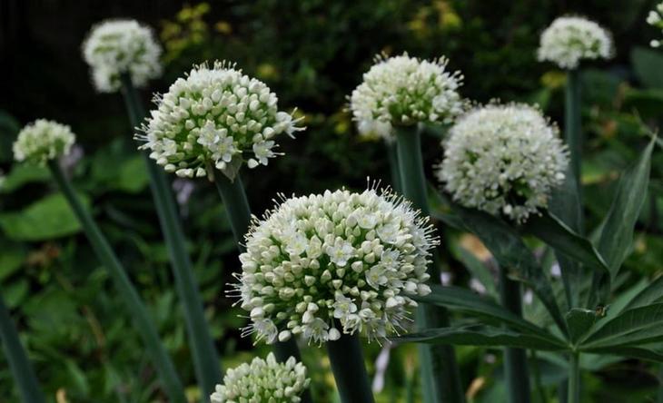 Прямі квітконоси цієї рослини прикрашають блідо-рожеві або молочні квітки-дзвіночки, нахилені вниз. Суцвіття дуже привабливі для бджіл, які роблять корисний цибульний мед.