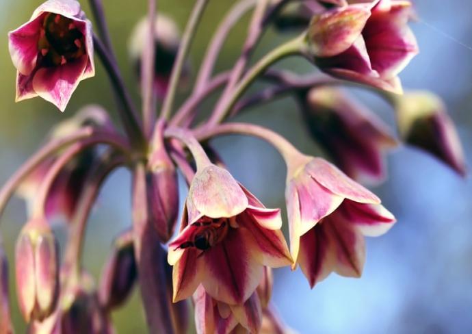 Цей декоративний лук цікавий дрібними пурпуровими квітками, зібраними в пухкі суцвіття-парасольки, які розташовані на поникающих квітконіжках. Цвітіння припадає на Серпень.