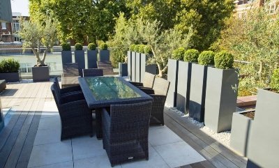 Високі прямокутні вази зі зростаючими в них самшиту можуть стати вдалим варіантом відділення плодового саду або городу від зони відпочинку