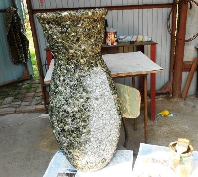 - Готову вазу покривають ґрунтовкою для зменшення пористості, фарбують акриловими фарбами або декорують лаком для зовнішніх робіт по бетону і каменю.