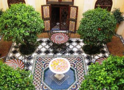 Чаша, заповнена кольоровими камінцями, в мусульманському саду може стати центром дворика, підкреслюючи симетричність і строгість форм композиції