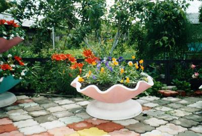 - Кілька високих чаш можна розмістити по колу, виділивши таким чином парадну частину ділянки, в центрі якої може стояти фонтан, альтанка або гойдалки.