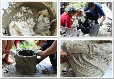 - Вийміть просочений бетоном матеріал і, не вичавлюючи, накиньте на відро, надавши ту форму вази, яку визначили заздалегідь.