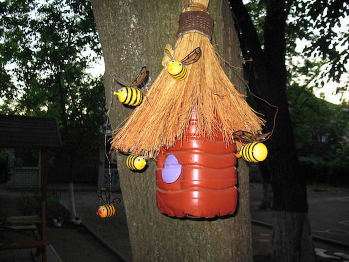 Досить часто з декоративною метою використовують пластикові п'ятилітрові бутлі, які можна знайти практично в кожному господарстві. Декоративні бджолині будиночки з такого матеріалу виглядають дуже оригінально і весело. До того ж такі вулики НЕ заселяють живими бджолами, що дуже розумно, якщо в будинку є маленькі діти або люди, які страждають алергічними реакціями на бджолині укуси.