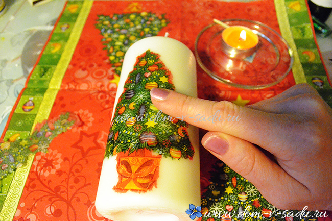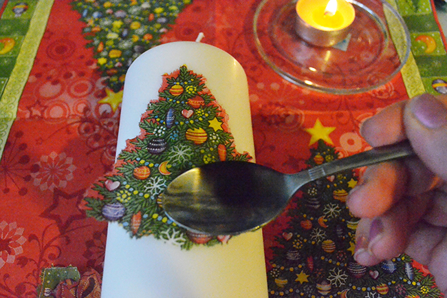 Нагрітої ложкою провести по малюнку від центру до краю. При цьому потрібно було злегка натискати на малюнок. Так поступово гарячої ложкою приклеїти всю серветку. Вийде, що малюнок як би упаюється в свічку. При роботі важливо не пропустити жодної ділянки малюнка. Вся деталь серветки повинна просякнута парафіном.