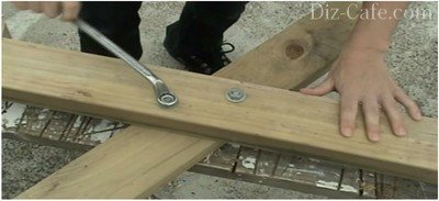 Розмістивши ноги столу під потрібним кутом, покладіть на них поперечки, а потім прихопіть деталі цвяхами. Після чого виконайте розмітку місць розташування болтів і просвердлите під них отвори. Притягну меблевими болтами ніжки столу до горизонтальних елементів стільниці та сидінь конструкції.