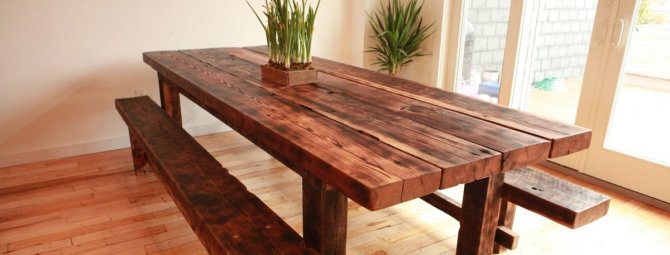 Після нанесення захисного і фарбувального складу на поверхню деталей дерев'яного столу вдається змінити зовнішній вигляд виробу до невпізнання. Погодьтеся – там виглядає набагато солідніше
