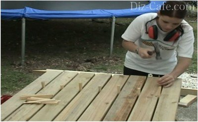 Дану операцію треба проводити з помічником, який потримає одну з боковин в вертикальному положенні до моменту її закріплення. Другу боковину, відповідно, ви тримаєте самі. На верхню частину поставлених боковин покладіть одну з восьми дощок настилу відповідно до розміченими лініями, які ви повинні нанести на деталі підтримки стільниці заздалегідь. Прикріпіть дошку цвяхами. Потім з іншого боку столу точно також прибийте ще одну дошку настилу.